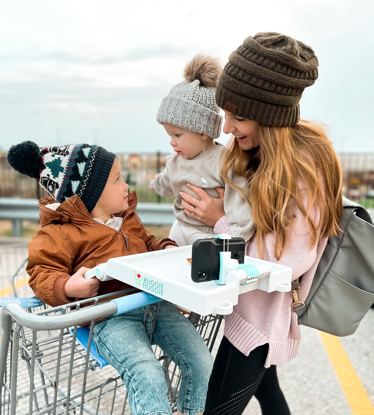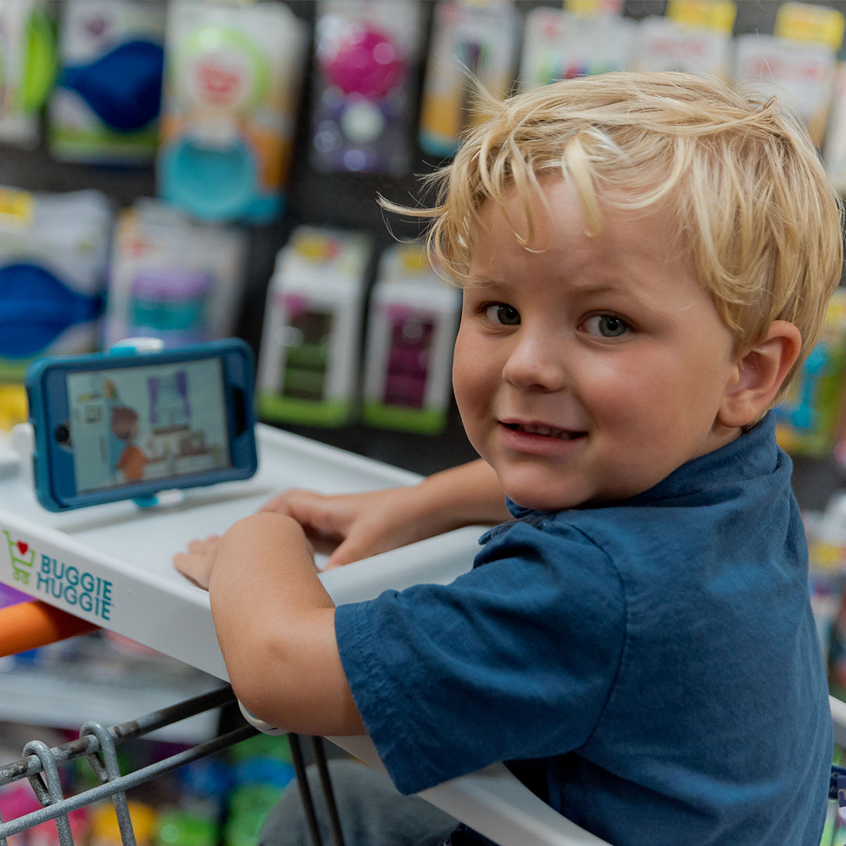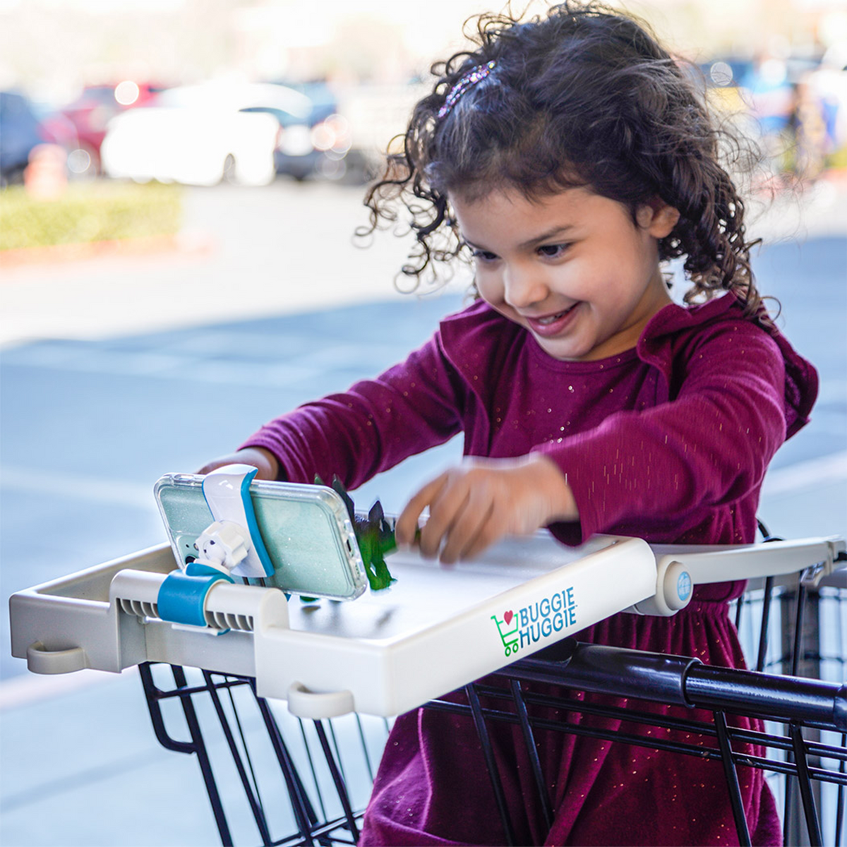 The Buggie Huggie Bundle provides Safety & Fun, All-In-One. Our shopping cart safety cover/tray is designed to help secure kids in the cart while shopping and provide entertainment for them. The tray can be used for snacks, toys, coloring books, and more. The Buggie Huggie is also very helpful with special needs children with Autism and Cerebral Palsy. The bundle includes an adjustable phone holder accessory that attaches to the tray. Your kids can enjoy their favorite show or game app while you shop in peace. The Phone Holder accessory fits the vast majority of smartphones.